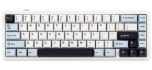 The EPOMAKER x Aula F65 65% wireless mechanical keyboard is a compact and stylish keyboard that works well for gaming and everyday use. Its smaller size means it takes up less space on your desk, but it still has all the important keys you need, including arrow keys and a simple layout that many people find easy to use. The light blue design gives it a fun look, and the RGB backlighting adds a nice touch that you can change to match your setup or mood.